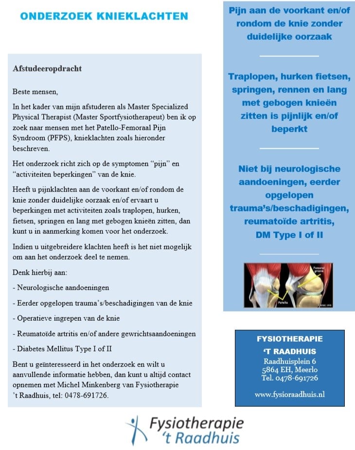 In het kader van zijn afstuderen als Master Sportfysiotherapeut is Michel Minkenberg op zoek naar mensen met het Patello-Femoraal Pijn Syndroom (PFPS). Het onderzoek richt zich op de symptomen ‘pijn’ en ‘activiteiten beperkingen’ van de knie. Lees meer in deze bijlage. Ben je geïnteresseerd in dit onderzoek, neem voor meer informatie contact op met Michel via 0478-691726.